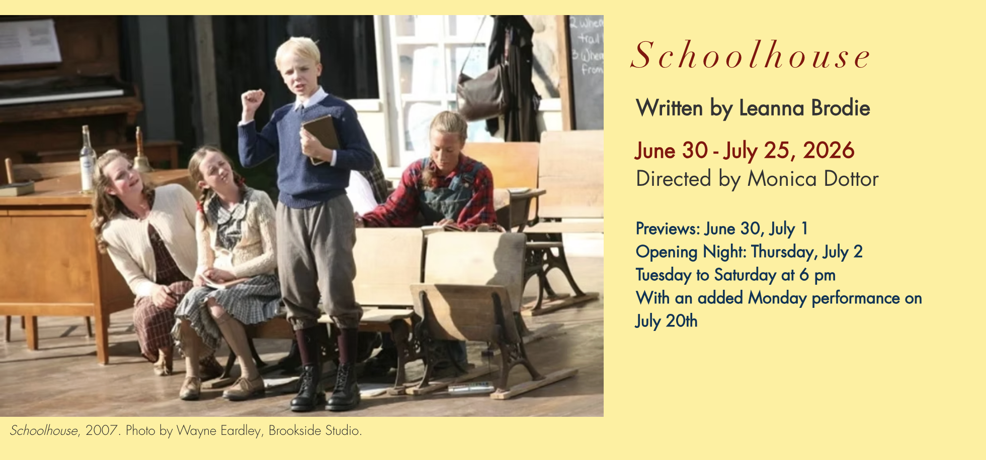 Catch a production of Schoolhouse by Leanna Brodie runs at 4th Line Theatre early summer 2026. Set in 1938 in a one-room schoolhouse, Brodie’s play Schoolhouse introduces a delightful and boisterous group of children who may just have met their match in eighteen-year-old teacher Melita Linton. For more details on 4th Line Theatre’s run of Schoolhouse and to purchase tickets, click here.