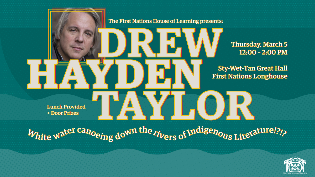 Award-winning author Drew Hayden Taylor (Open House, Cottagers and Indians, and more) is giving a special talk at Sty-Wet-Tan Great Hall, First Nations Longhouse at UBC.