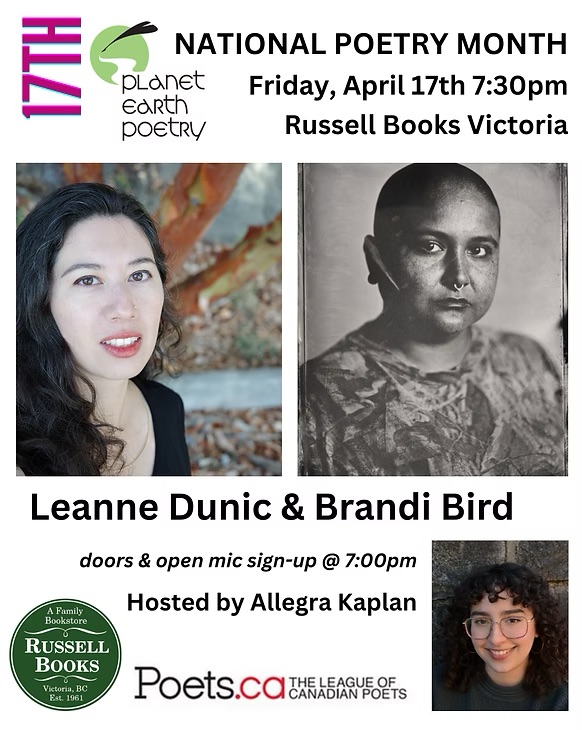 Catch Leanne Dunic, author of the award-winning collection wet and One and Half of You featuring alongside Brandi Bird at Planet Earth Poetry. More details are available here.