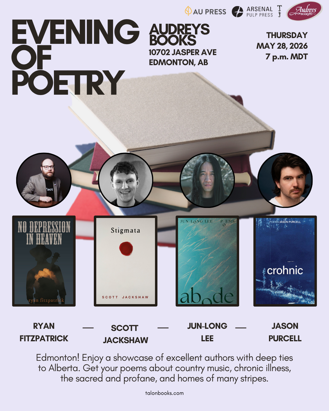 Edmonton! Head to Audreys Books for an evening of poetry from stellar authors with deep ties to Alberta! ryan fitzpatrick will read from No Depression in Heaven, Scott Jackshaw will read from their debut collection Stigmata, Jun-long Lee will read from his debut collection Abode, and Jason Purcell will read from Crohnic.