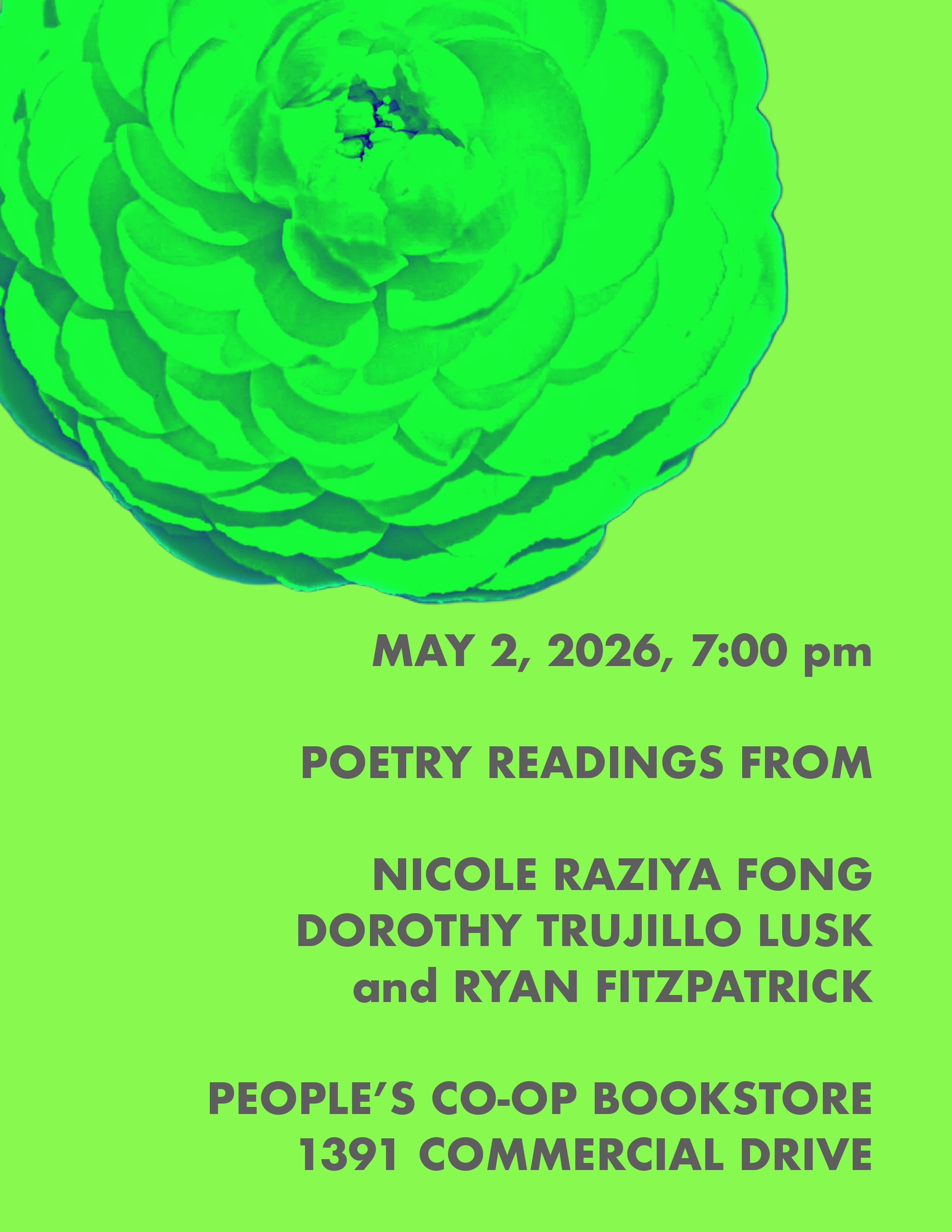 Enjoy a night of poetry on May 2 at People’s Co-Op Bookstore! ryan fitzpatrick will share work from No Depression in Heaven, Nicole Raziya Fong will read from SUBTEXT, and Dorothy Trujillo Lusk will share poetry from her ouevre. Attendance is free! For further information, click here. Hope to see you there!