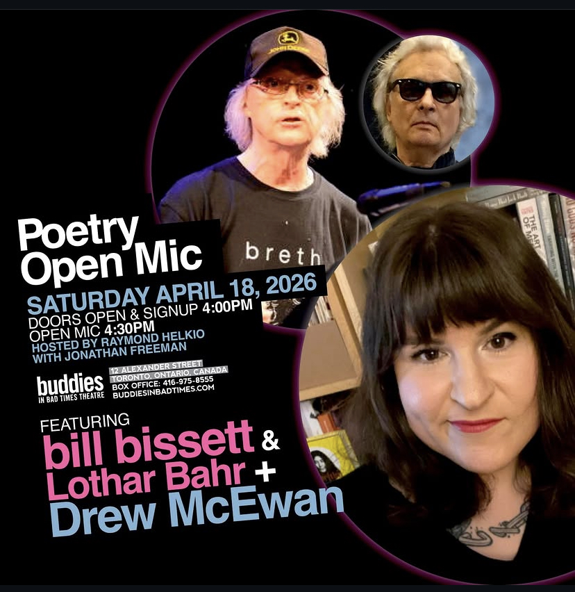 Catch Drew McEwan author of tours, variously and bill bissett author of th book uv lost passwords 1 accompanied musically by Lothar Bahr featuring at the Poetry Open Mic at Buddies in Bad Times Theatre! The Poetry Open Mic at Buddies in Bad Times Theatre is an all-ages, licensed PWYC event, allies always welcome! This event is hosted by the amazing Raymond Helkio and Jonathan Freeman. For more details, click here.