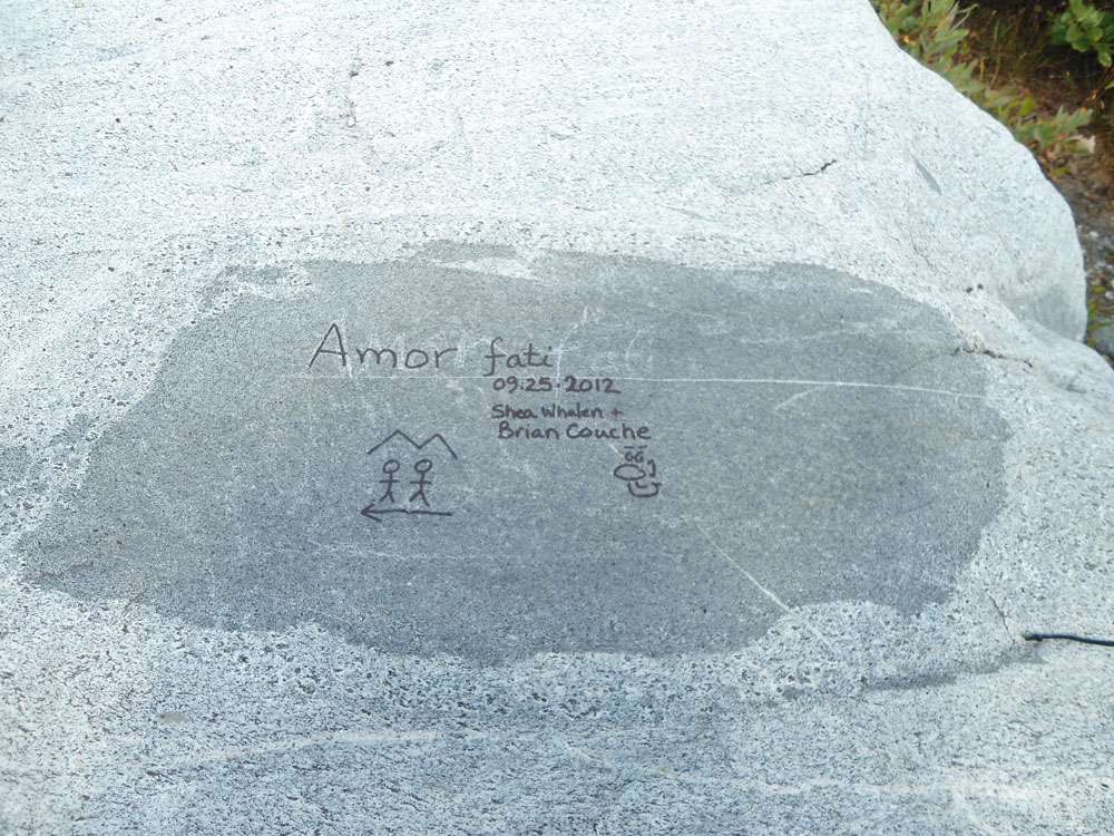 During our trek, we left our personalized calling card, signed “amor fati” (from Latin: acceptance or “love of fate”) in honour of Russell. We hope others who follow will respect Mother Nature, leaving only a small footprint too.