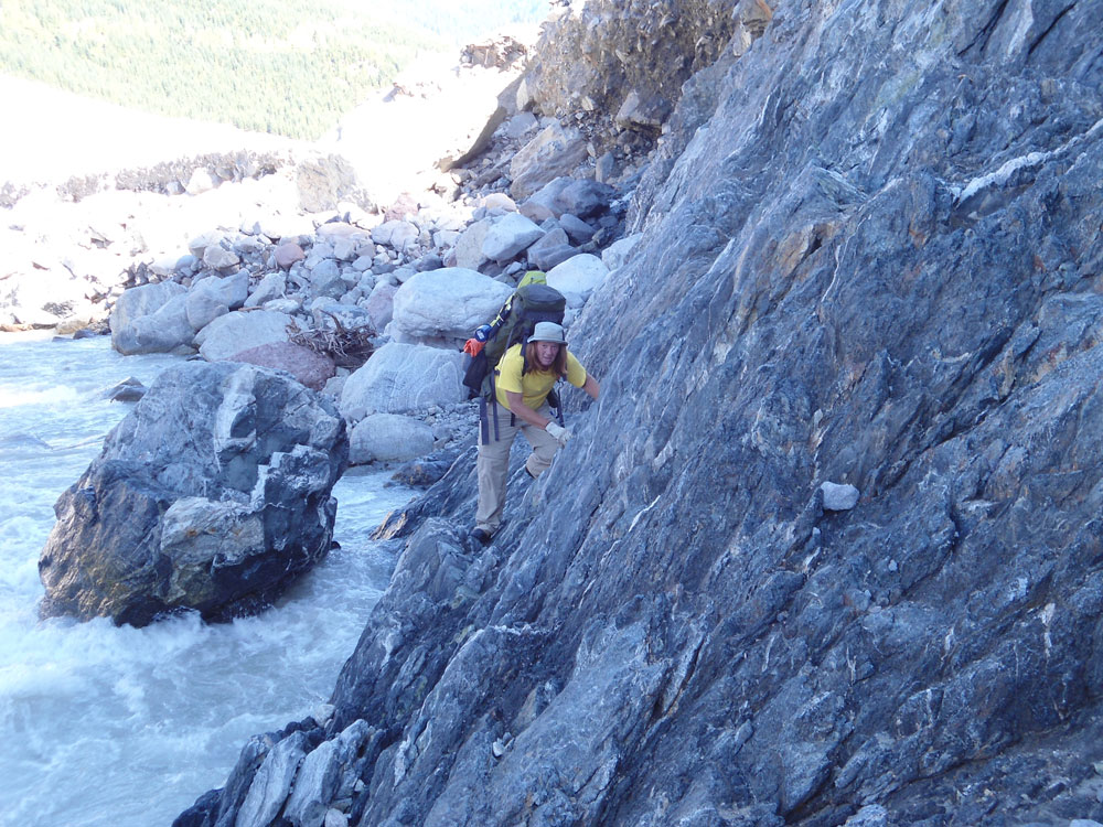 Brian negotiates the rock face near the confluence of Meager Creek and Capricorn Creek, where on August 6, 2010, 48.5 million cubic metres of debris slid down the Capricorn Glacier in what was possibly the largest landslide Canada had experienced in recorded history. (See coverage from The Tyee for more detailed information, and view aerial photographs by D.B. Steers.)